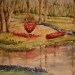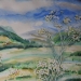 Landschap in aquarel met bloemscherm (fluitenkruid) op de voorgrond.